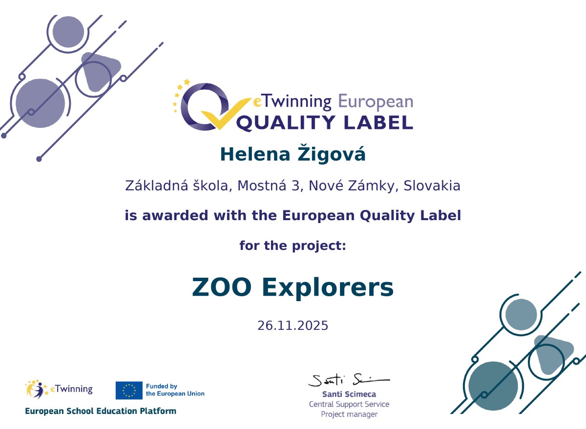 Dňa 26.11.2025 nám bol udelený Európsky certifikát kvality (EQL) za úspešnú realizáciu projektu eTwinning“ZOO Explorers“